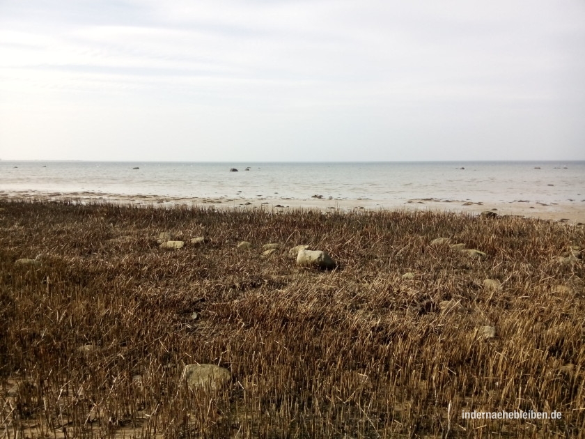 Die ersten paar hundert Meter der Insel kann man am Strand noch entlang des Zaunes spazieren und wenigstens die Kasernen sehen. Seltsamerweise ist die Stimmung ausgesprochen friedlich. Eine Ziegenherde stapft durch das hohe Gras und im Hintergrund rauscht die Ostsee.