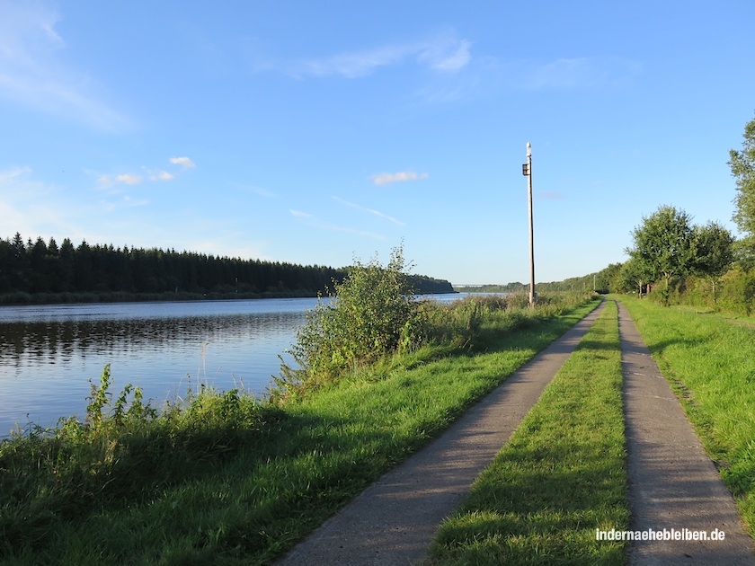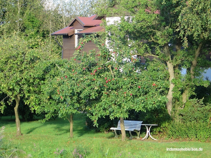 Die Ruhe ist himmlisch. Nicht einmal entfernt sind Autos zu hören. Zu den vielen Vorzügen des Kanals gehört die Tatsache, dass das südliche Ufer abends verhältnismäßig lange in der Sonne liegt. Und das nördliche morgens. Wären wir welche, die gern ein Häuschen hätten, dann hier. Mit einer weißen Bank unter Apfelbäumen.