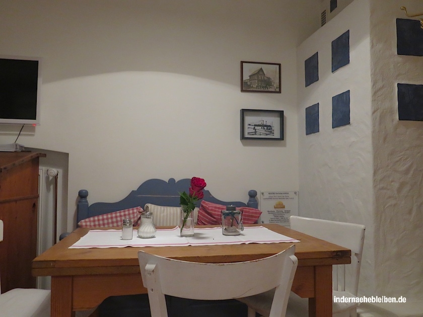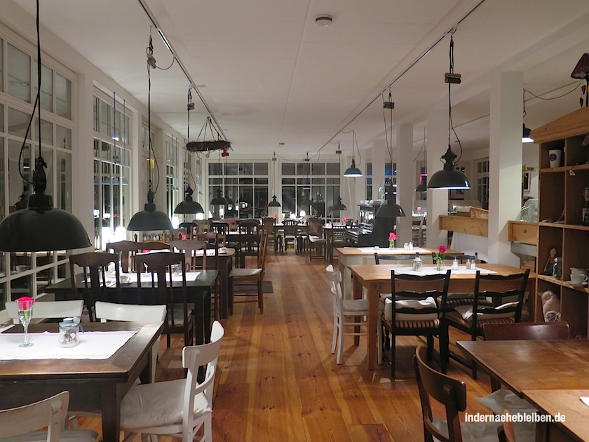 Im Restaurant werden bereits die Frühstückstische gedeckt, als wir satt und müde und zufrieden die Segel streichen. Susi vom Service versorgt uns noch mit einem Betthupferl. Nett ist es im Burger Fährhaus. Lässig. Und unser kleines Zimmer ist wie eine Koje. Schön kühl, obwohl der Tag heiß war.
