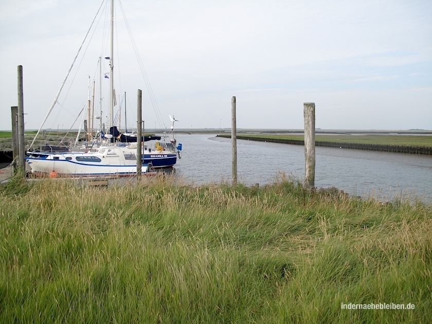 Apropos Abschied: Auf dem Rückweg machten wir noch einen kurzen Abstecher zum Hafen im Tümlauer Koog. Hier blickt man über die letzte nicht eingedeichte Bucht an der Westküste Schleswig-Holsteins – bis zum Leuchtturm von Westerhever.