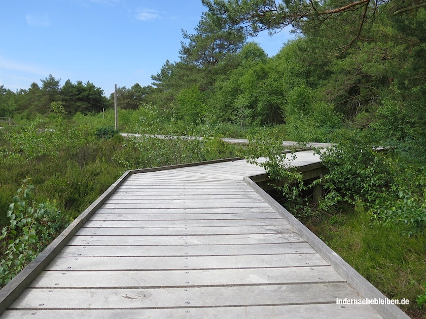 Alle paar Kilometer führen Fußwege zu Aussichtspunkten, was die Tour schön langsam macht (wenn man will). Der erste Abstecher führt auf einem Bohlenweg entlang eines ehemaligen Torfkanals zum Großheidorner Turm.