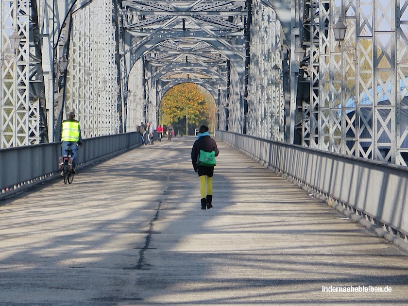 Die Eisenfachwerkkonstruktion von 1897 war die erste feste Straßenverbindung über die Süderelbe. Heute ist sie die letzte ihrer Art, inzwischen Fußgängern und Radfahrerer vorbehalten. Es ist schwer zu entscheiden was schöner ist: die Sandsteinportale? Das Eisenfachwerk? Der Blick? Der Tag? Der Herbst?