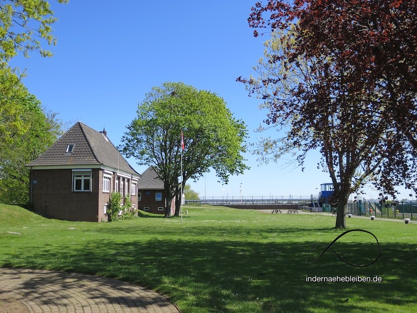 Der touristische Hotspot von Brunsbüttel liegt an der nördlichen Seite der Schleuse. Dort befinden sich Aussichtsplattformen und Touristinfo, das Schleusen-Museum und eine kurze Fischbrötchen-Meile. Normalerweise ist das der belebte Teil der Stadt. Aber derzeit darf man noch gar nicht aus touristischen Gründen kommen, sondern bloß für »kontaktarme Sportarten«, wie z.B. Wandern. (Und dann kriegt man auch ein Fischbrötchen auf die Hand).