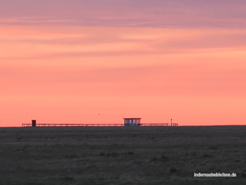 Ich bin nicht sicher, ob die Salzwiesen rund um das Badehäuschen von Neuwerk dazu gehören. Einerseits muss man da ja wohl irgendwie hinkommen. Andererseits kann ich keinen speziellen Weg entdecken. Sicherheitshalber bewundere ich den Sonnenaufgang vom Deich aus.