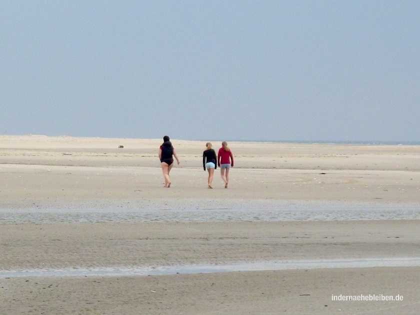 Flach ist die Nordsee bei ablandigem Wind. Kristallklar. Warm. Und ich kann nicht glauben, kann einfach nicht glauben, wie schön es ist. Je weiter ich gehe, desto einsamer wird es. Bald sind kaum noch Spaziergänger unterwegs. Ab und zu traben Reiter auf kräftigen Pferden an mir vorbei. Hin und wieder kommt mir ein Radfahrer entgegen. Ich wate auf Sandbänken. Tauche ins Wasser. Lasse mich von der Sonne trocknen. Einmal werde ich von einer Robbe beobachtet. Sie schwimmt eine zeitlang neben mir her. Im sicheren Abstand von ungefähr 30 Metern, versteht sich. Einmal trete ich fast auf einen Stein. Der einzige, den ich in 2 Stunden sehe. Und der gar kein Stein ist. Sondern ein ziemlich großer Krebs, der wieselflink Reißaus nimmt.