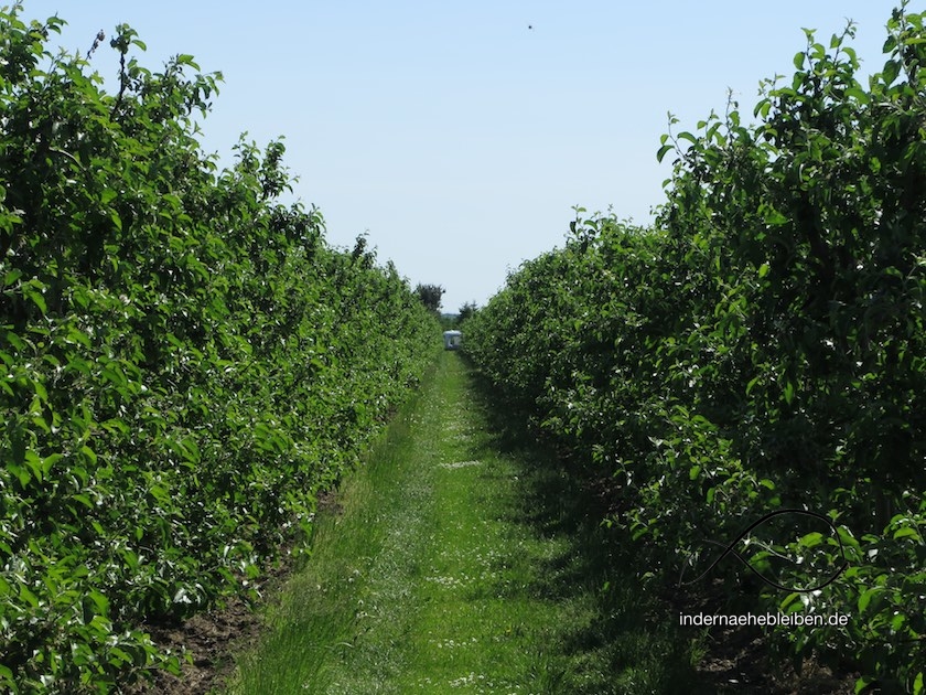 Man glaubt ja nicht, wie weitläufig so eine Apfelplantage ist. Die schnurgeraden Reihen der schnurgeraden Obststräucher schienen sich bis in die Unendlichkeit zu erstrecken. Wir trafen keine Menschenseele. Und hörten bald nur noch Vögel, Frösche (viele Frösche) und Bienen. Unter dem ebenso end- wie wolkenlosen Himmel kam es mir vor, als wären wir irgendwo in Iowa. Bis in der Ferne ein weißer Cube durchs Grün funkelte wie das Ding aus einer anderen Welt.
