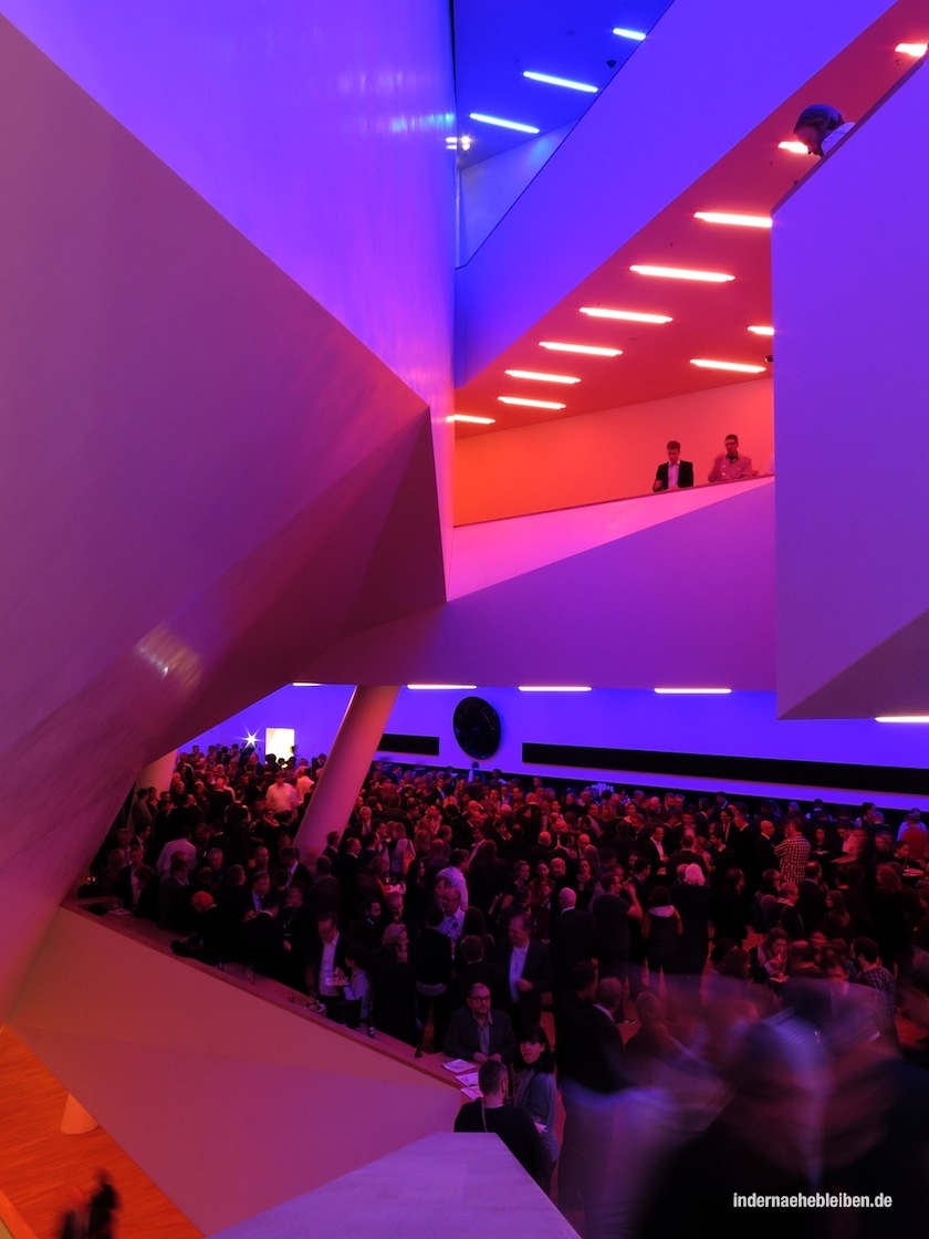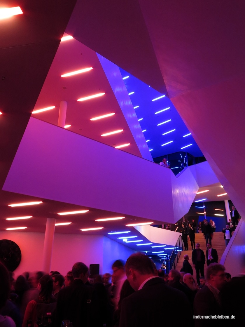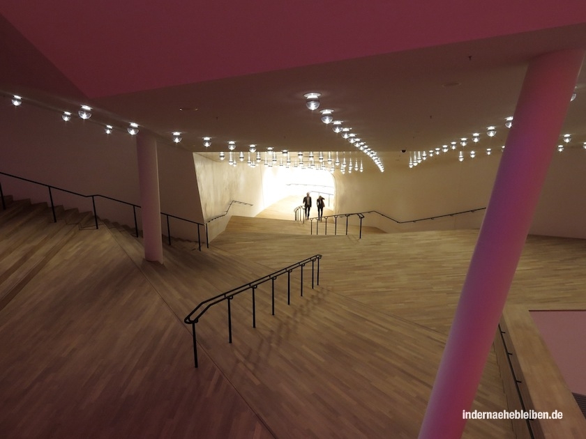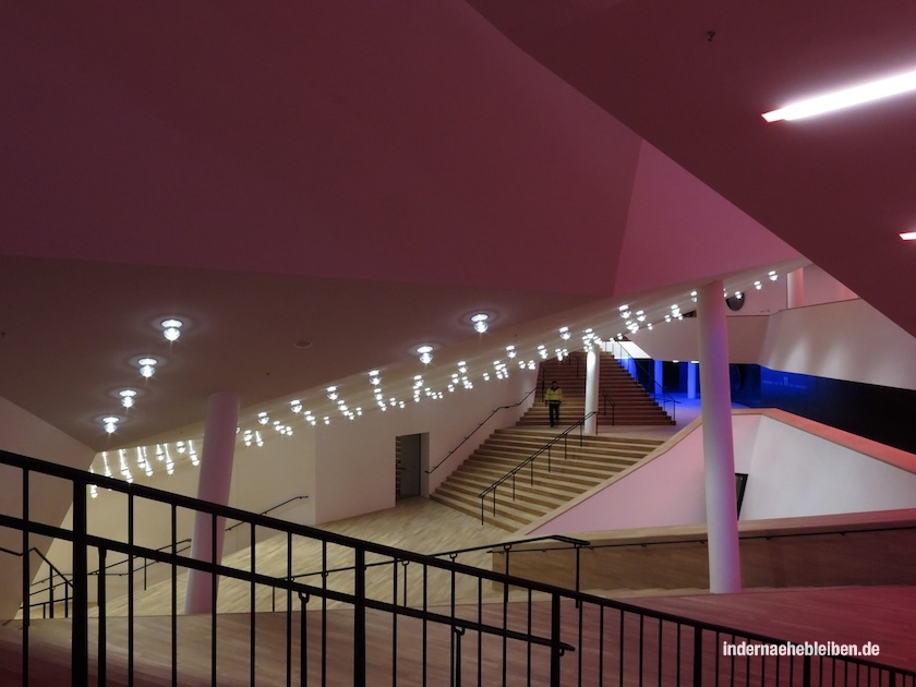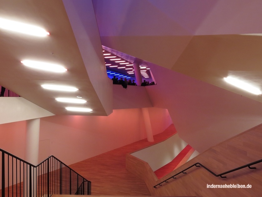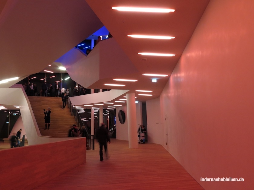 Der Weg zum Konzertsaal über die sogenannte Tube mit den beiden Rolltreppen und der Aussichtsplattform dazwischen auf die Plaza und von dort über die organisch geschwungenen Treppen in den fast schon psychedelisch wirkenden, sich über mehrere verschachtelte Ebenen erstreckenden Foyer Bereich ist ein Erlebnis für sich. Die fantastischen Aussichten über die Stadt und den Hafen nimmt man dabei kaum noch wahr.