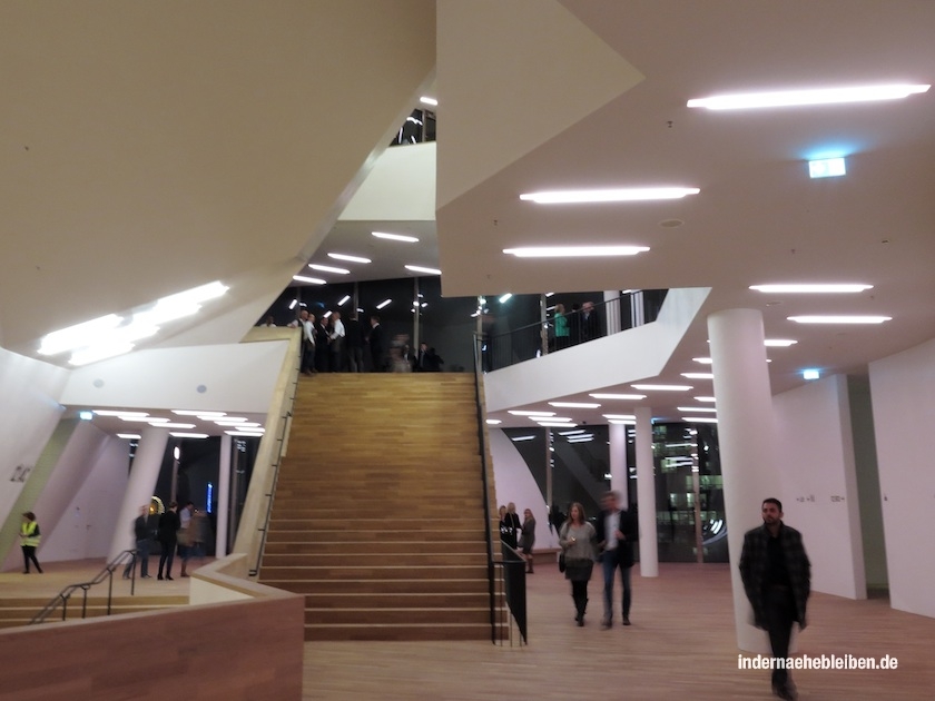 Doch genug der alltäglichen Horrorgeschichten aus dem Bauleben. Ich hatte wie bereits erwähnt die Entstehung des Gebäudes in den letzten beiden Jahren recht hautnah miterlebt, aber die Bereiche des Foyers vor den Sälen bisher nicht in einem auch nur annähernd fertigen Zustand gesehen. Von daher war ich sehr gespannt, wie es geworden ist.