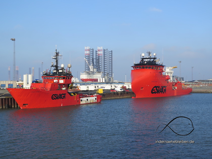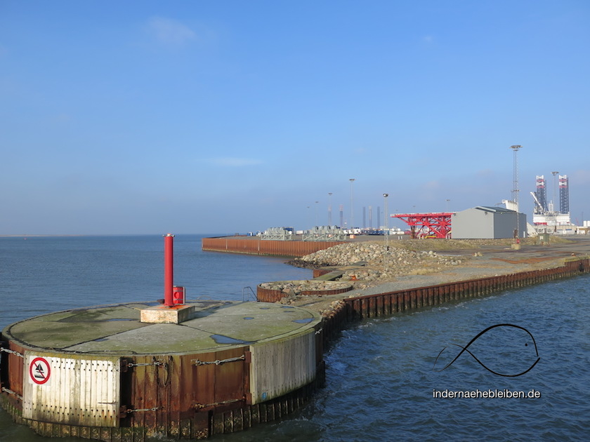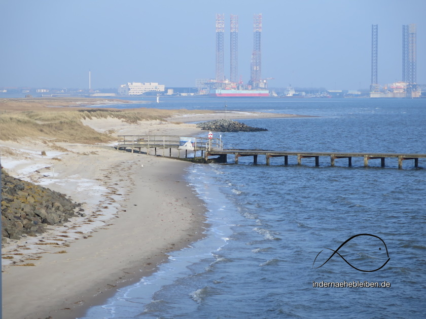 268 km von unserer Hamburger Haustür entfernt liegt die vielleicht uncharmantesteste Hafenstadt Dänemarks. Esbjerg hat sich ganz dem Offshore-Geschäft verschrieben. (Auch in der Innenstadt habe ich auf vorherigen Stippvisiten noch nichts allzu Spannendes oder Schönes entdeckt; Ein- oder Widersprüche wären mit natürlich sehr willkommen im Kommentarbereich.) Also halten wir uns auch gar nicht länger am Festland auf – nur ein schnelles Foto – beim Wahrzeichen der Stadt, den 9 m hohen Menschen am Meer – und dann ab auf die Insel.