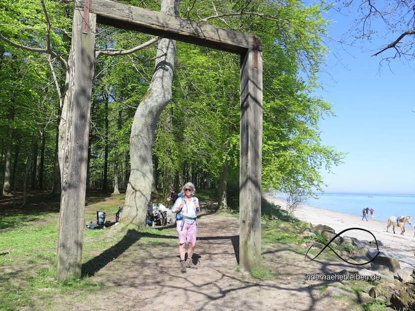 Im Rücken der Eiche spannt sich ein überdimensionales Holztor über gleichermaßen empfehlenswerte Pfade. Sie führen in den Wald hinein, zum Gut Östergaard hinauf oder die Küste hinunter. Ich weiß nicht, wer das Tor errichtet hat oder warum. Doch ich muss hier immer an das Ende von Susanna Tamaros bekanntestem Roman denken. (Denn das ist ja das Geheimnis von Stränden: auch die kleinsten bieten Platz genug für große Gefühl.)