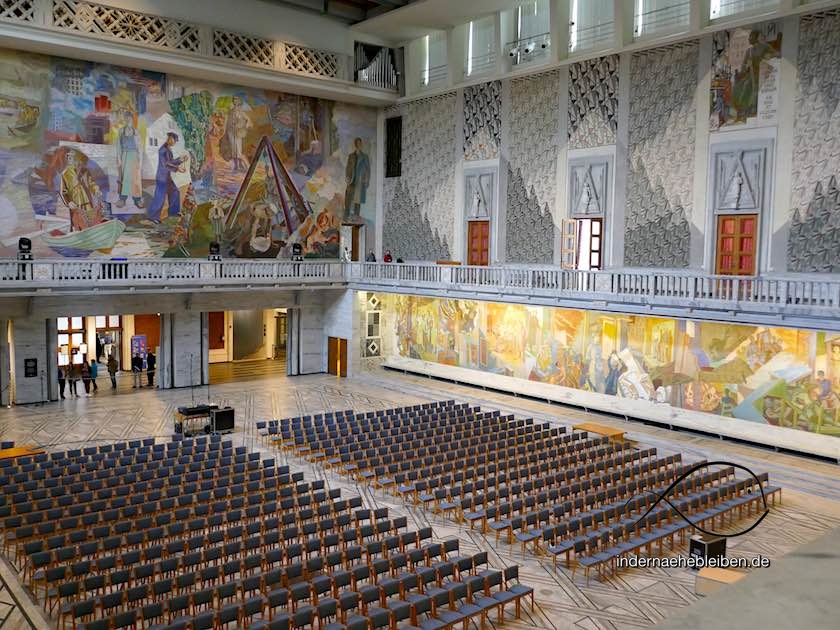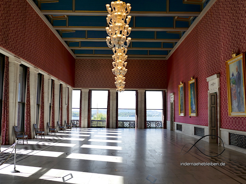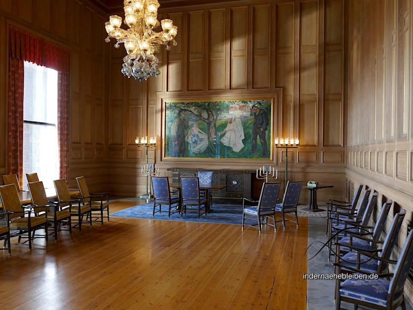 Schön lässig skandinavisch, ist es erlaubt durch Hallen, Säle, Flure zu stromern und auf verschiedene Balkons mit fantastischen Ausblicken auf den Oslofjord. Jede Räumlichkeit wurde von einem anderen Künstler gestaltet. Alle Materialien, Gemälde, Einrichtungsgegenstände kommen aus Norwegen. Der Besuch kostet mal wieder gar nichts – lohnt sich aber hoch zehn.