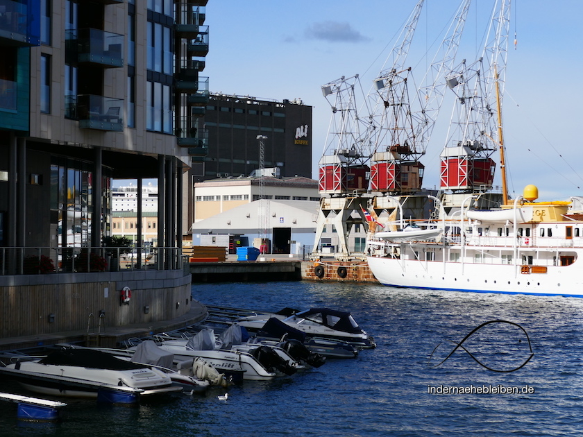 Die Hafenpromenade schlängelt sich von der Oper noch 2,7 km weiter bis zum Containerhafen Kongshavn. Doch selbst die hastigsten Mini-Kreuzfahrer müssen spätestens jetzt an den Rückweg denken. Am schnellsten gehts per Taxi. Günstiger mit Öffis.