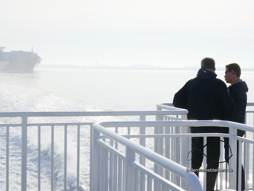 Als wir die Tour neulich unternahmen, war an Deck des Halunder Jets auffällig mehr los, als ich es normalerweise auf Fähren beobachte. Ich wundere mich immer wieder, wie viele Menschen Schiffsreisen unter Deck verbringen. Nicht so auf der Elbe. Hier blieben jede Menge Passagiere an der frischen Luft – interessanterweise vor allem Männer. Es ist aber auch eine besonders spannende Passage.