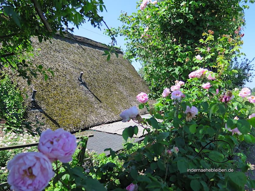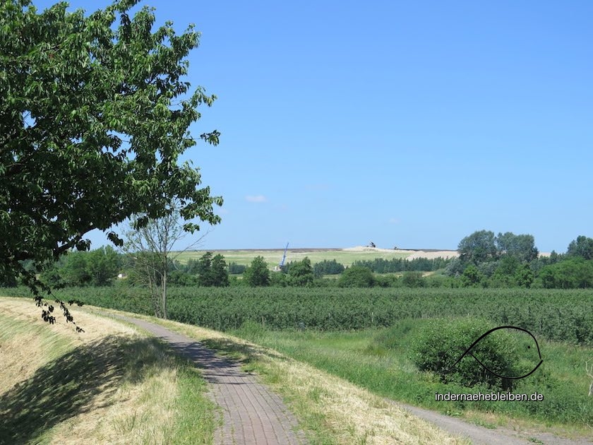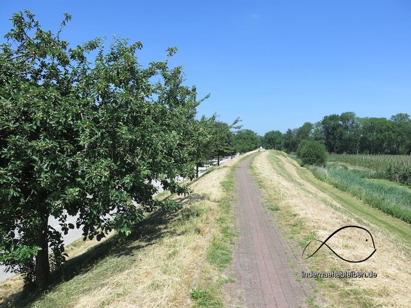 Aufgrund der wochenlangen Dürre ist das Gras auf dem Deich verbrannt. Auch heute knallt die Sonne wieder heftig vom Himmel. Die Luft flirrt. Die Grillen zirpen. Und hätte ich gewusst, dass der Francoper Hofladen Mittwochs geschlossen hat, hätte ich mehr Wasser mit auf den Weg genommen. Seit ich vor gut 10 km aus der S-Bahn stieg, bin ich noch an keinem Geschäft oder Lokal vorbeigekommen.