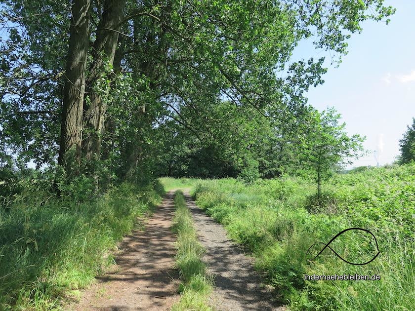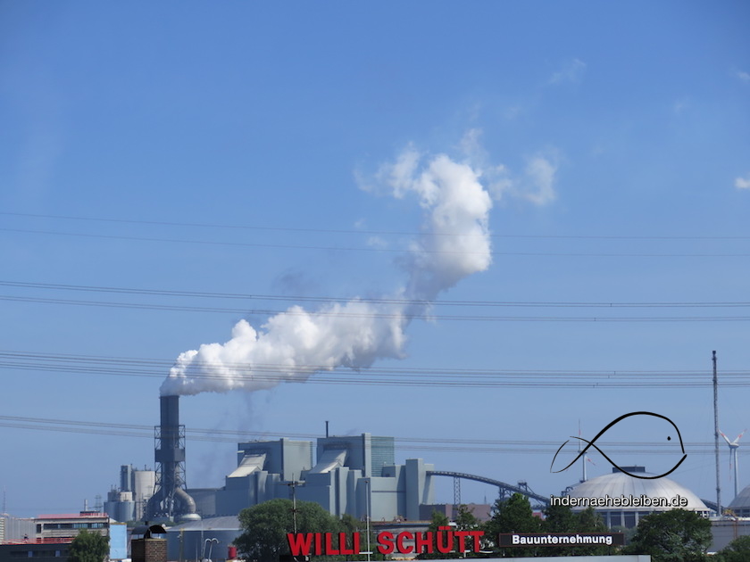 Der hügelige Meyers Park wirkt wie ein verlassener Buchenwald. Selbst die tollen Spielplätze sind verwaist. Es ist herrlich kühl und schattig unter den mächtigen Bäumen. Zu schnell erreiche ich die vielbefahrene Stader Straße und das schockierende Moorburger Panorama. Es schockiert mich etwa einen 1 km lang. Dann schlägt sich der Weg am Ende des Moorburger Bogens linker Hand wieder in die Natur.