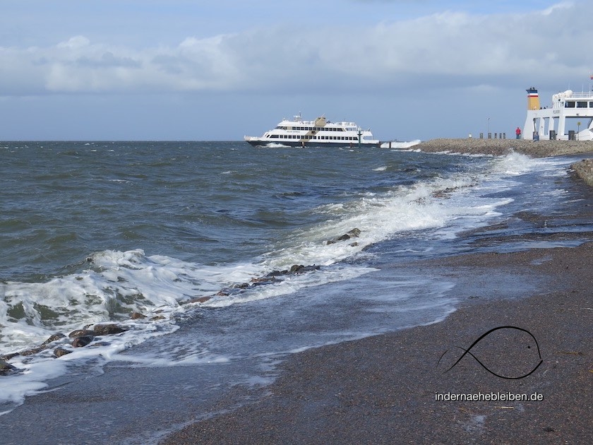 Man darf nichts dagegen haben, beim Spazierengehen mit einer Hand die Mütze festzuhalten. Denn die fliegt einem sonst vom Kopf. Und wenn es gleichzeitig regnet und stürmt, muss man es faszinierend finden, von einer bestimmten Stelle auf dem Deich aus dem Auto heraus die tobende Nordsee zu betrachten. So wie es auch viele Nordstrander machen. (Die übrigens ganz normale Autos fahren. Und keine SUVs. Was sehr bezeichnend für die Insel ist.)