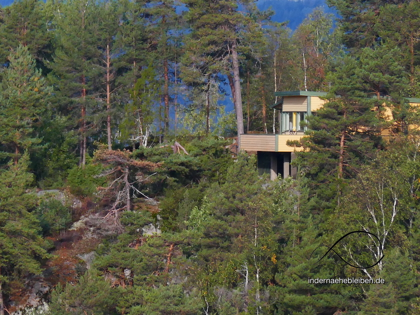 Wer jetzt nicht so fanatisch auf einsame Holzhütten reagiert wie ich, darf sich mit dem Deckbesuch vermutlich auch Zeit lassen. Ich kann das nicht beurteilen, weil ich keine Minute des Fjords hätte missen mögen. Tatsächlich aber wird alles immer schöner, je höher die Sonne steigt und je mehr der Fjord sich verjüngt. Dem einen oder der anderen reicht das vielleicht auch eine Stunde lang. Oder aus dem Bullauge heraus.
