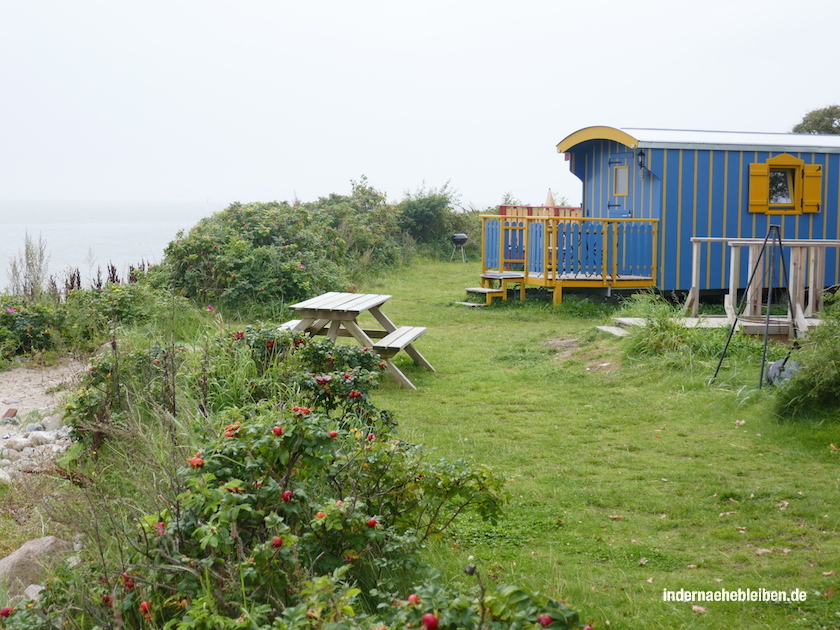 Unser POD befindet sich am Ende des langen, schmalen Campingplatzes von Langholz. Es ist groß genug, dass man in der Mitte stehen kann. Die Ausstattung besteht aus zwei Lattenrosten und Matratzen, Steckdosen, elektrischem Licht und sogar einer Heizung. Auf die Veranda passen zwei Stühle und ein Tisch. Komplettiert wird die Einrichtung durch einen kleinen Kugelgrill und eine Hängematte mit Gestell, die man gern an den Strand schieben darf, der exakt 2 Trittsteine vorm POD beginnt. Näher am Meer geht nicht.