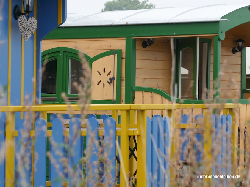 Von unserem POD aus gesehen gleicht der Platz mit den bunten Zirkuswagen schon dem Bild, das Inhaber Christoph Albrecht in seiner Zukunftsvision beschreibt. Seit 2014 werkelt er mit seinem Team daran, einen Campingplatz jenseits aller Negativ-Klischees und Schrebergarten-Atmosphäre zu schaffen. So steht es in dem Manifest, das in der kleinen Speisenkarte des Bistros Strandräuber abgedruckt ist.