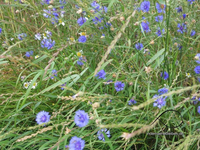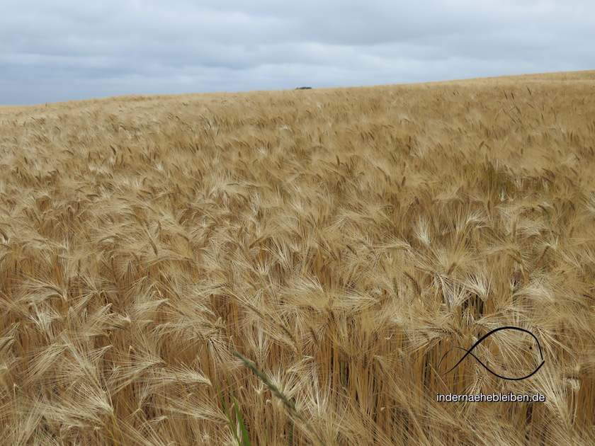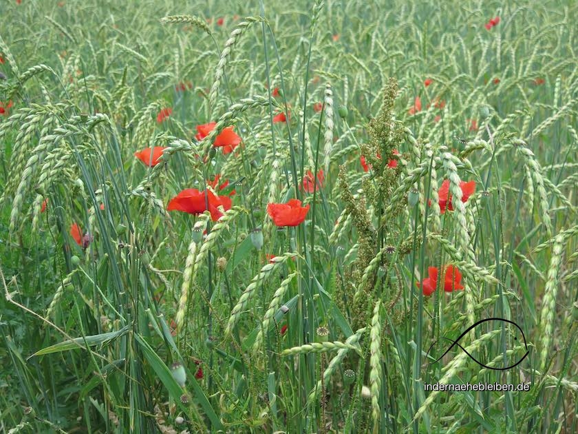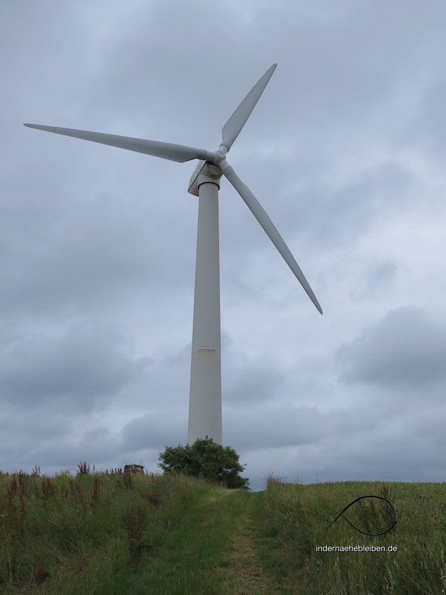 Der Weg entfernt sich nun immer weiter von der Küste. Als ich – zum ersten Mal seit Surendorf – eine Straße erreiche, glaube ich kurz, das Andreaskreuz würde mich in die falsche Richtung schicken. Aber dann entdecke ich auf der anderen Straßenseite einen ganz schmalen Pfad, der sich in die Felder schlägt. Der E1 zieht hier einen längeren Umweg ins Land hinein. Es geht durch wogende Ähren begleitet von Mohnblumen, Kornblumen und dem intensiven Duft nach Kamille bis zu einem erhöhten Windrad.