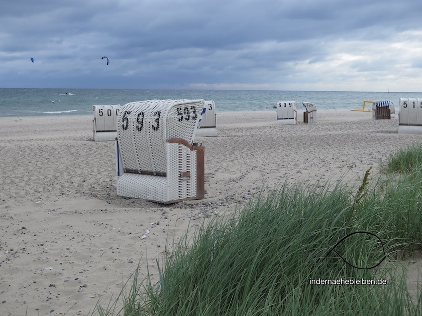 Ich betrachte die Szenerie eine Weile in einen Strandkorb gekuschelt. Es ist erst 8 Uhr. Die Geschäfte und Restaurants haben noch geschlossen. Über den Campingplatz schlappen Frühaufsteher mit Brötchentüten. In der Surfschule nebenan rühren einige Kinder schläfrig in ihren Cornflakes. Eine handvoll Kiter saust über die Wellen. Zwei Unerschrockene nehmen ein Bad.