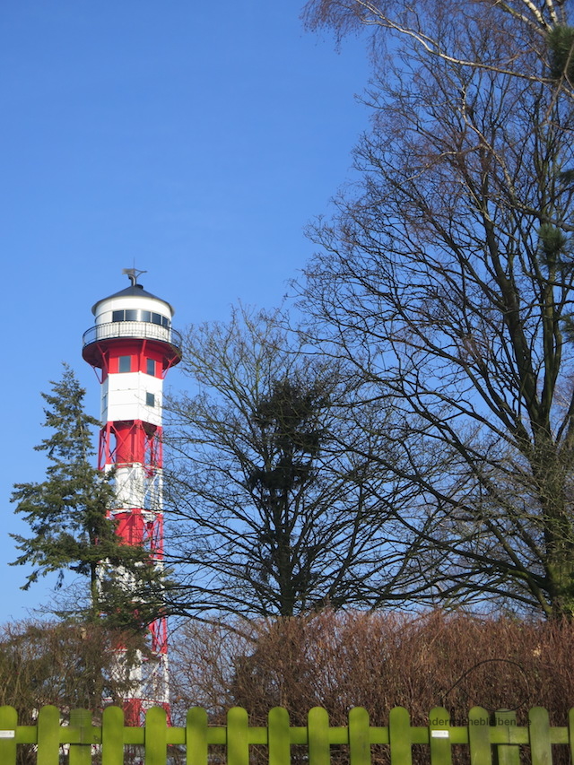 Auf den schluchtartigen Wegen von Falkenstein hinunter zum Strand bin ich immer wieder hingerissen. Unten angekommen, fällt als erstes eine Gruppe Linden auf. Die Bäume wurden um 1900 gepflanzt und markierten die Sommerterrasse des Fährhauses Wittenbergen. Damals kamen die Hamburger in Scharen mit dem Dampfer. Es gab Badekabinen, Strandkörbe, einen Musikpavillon, Schießbuden und Karussells. Heute gibt es nur noch die Linden. Und die Leuchttürme, die ebenfalls um 1900 in Betrieb genommen wurden. Der erste steht direkt am westlichen Ende des Strandes; das Unterfeuer von Wittenbergen.