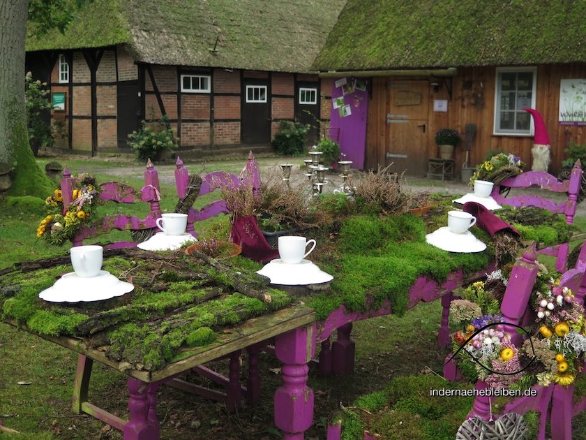 Waldgeister sind total scheu. Am ehesten trifft man sie ganz früh morgens, wenn der Tau in den Netzen der kleinen Heidradspinne funkelt. Günstig stehen dann die Chancen, den verrückten Hutmacher aus Alice im Wunderland zu treffen. Er scheint in Ehrhorn regelmäßig den Tisch zu decken. Kommt man wie das weiße Kaninchen zu spät, kann man immerhin Wiesentapas und Gänseblümchen Limonade in der Wildkräuterey probieren. (Wer etwas für schöne Blüten und köstliche Speisen übrig hat, unbedingt Klick)