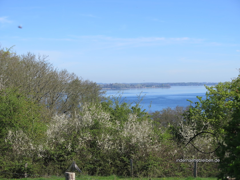 Es ist nicht nur die geschwungene Landschaft, die uns bezaubert und die Flensburger Außenförde, die heute glitzert wie in Südfrankreich. Es sind auch die typischen Knicks, derzeit vor allem der strahlende Weißdorn, der hier mannshoch blüht.