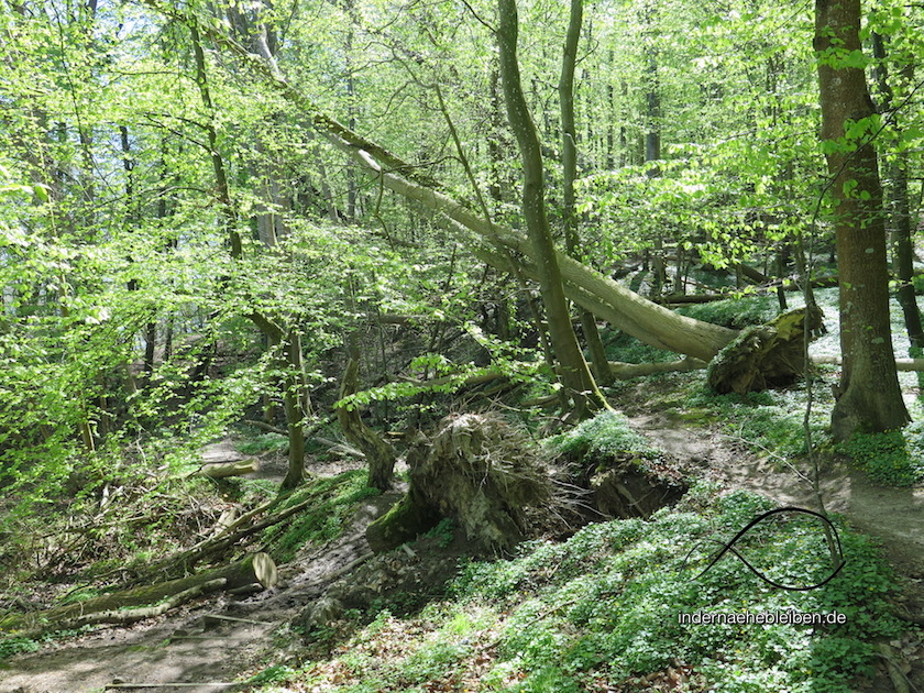 Am Strand sind wir für einen Moment nicht mehr sicher, ob wir richtig sind. Die Beschilderung ist heute nicht ganz so üppig gestreut wie auf der gestrigen Etappe von Flensburg nach Holnis. Und es gibt nun auch gar keinen Weg mehr. Erst als wir den Wald erreichen, ist beides wieder da. Ganz verwunschen ist der Wald von Sigum, schwer gebeutelt von den Stürmen im letzten Jahr. Bei Hochwasser oder nach langen Regenfällen, muss ein Umweg genommen werden. Selbst bei prächtigem Wetter ist es hier und da ziemlich matschig. Und traumhaft schön. Nach nochmaligen Aufstieg erreichen wir Langballigau.