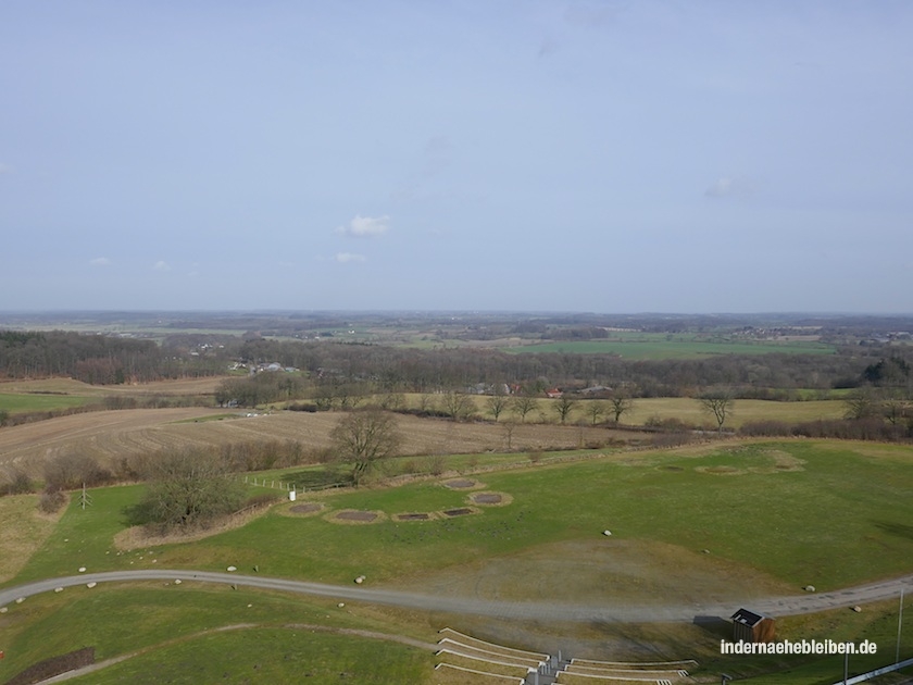 Der Blick von da oben ist echt famos. Winzig wirkt das Bismarck-Denkmal. Dabei ist es 7 m hoch. Geschaffen wurde die Statue in der Nähe von Apenrade. Noch vor der Abstimmung zur deutsch-dänischen Grenzfrage im Jahr 1920, brachte man den Bismarck mit der Eisenbahn nach Rendsburg (sicher ist sicher, ich sagte es ja schon). Dann wusste man nicht so recht, wohin mit dem Koloss und verstaute ihn in einer Scheune in Ascheffel. Erst seit 1930 fand er einen Platz auf dem Aschberg und wacht seitdem über die Hüttener Berge. Entweder für ewige Zeiten oder bis jemand wie Espersen eine neue Grenzziehung erwirkt. Wohin der Bismarck dann wohl zieht? Vielleicht ja ins Outlet Neumünster? (Ich glaube, die fänden das gut.)
