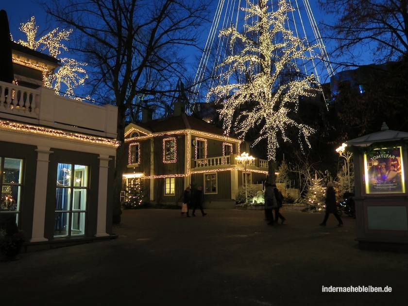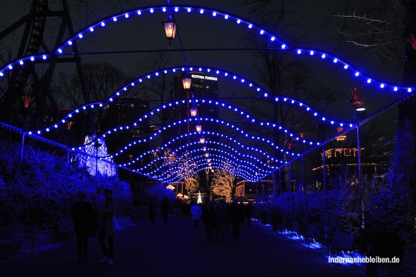 Was für eine Frage! Klar, müssen wir. Unbedingt. Schnell. Dabei würde ich in Deutschland lieber Gras essen, als einen Vergnügungspark zu betreten. Aber in Skandinavien ist das was anderes. Vor allen Dingen in Liseberg, wo in der Weihnachtszeit Licht- und Deko-Künstler sich mal so richtig ins Zeug legen. Als wir – endlich – die Tickets in der Hand halten, ist es 15.05 Uhr. 10 Minuten hat das elende Anstehen gedauert. Eine Ewigkeit (die man sich sparen kann, denn nach dem Anfangsandrang bilden sich keine Schlangen mehr vor den Kassenhäuschen).