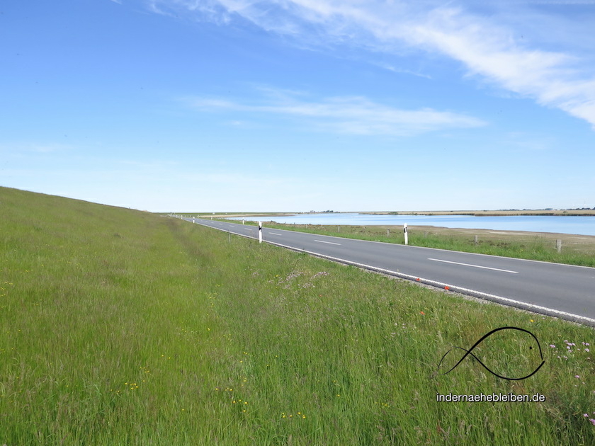 Mit Tiefstapeln kennt man sich auch 30 Kilometer weiter südlich im Hauke-Haien-Koog aus. Der Koog besteht zur kleineren Hälfte aus Äckern, zu größeren aus Speicherbecken – also Wasserflächen; und die stehen unter Schutz. Das sieht recht hübsch aus, wenn man mit dem Auto dran vorbeibraust. Und eben das machen zu gewissen Zeiten richtig viele – und richtig schnell (aus Angst, die Fähren in Dagebüll oder Schlüttsiel zu verpassen).