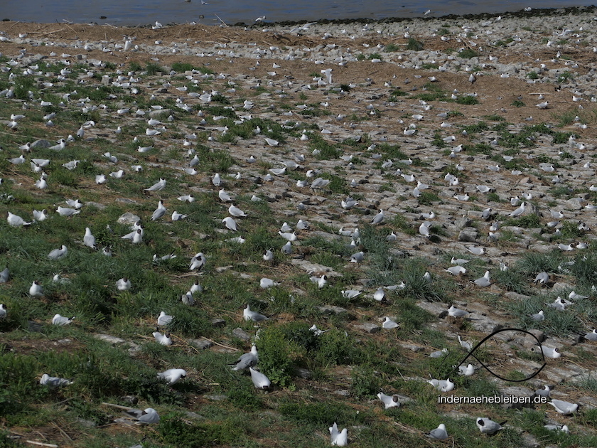 Es gibt sicher romantischere Orte, allerdings eignet sich das asphaltierte Deckwerk am südlichen Rand des Sperrwerks gar nicht so schlecht zum Nestbau. Schüttsteine verhindern, dass die Eier aus den Gelegen rollen und das Buffet der Eidermündung ist bei Ebbe reich gedeckt. Das Spektakel beginnt im Mai und zieht sich mindestens bis Ende Juni.
